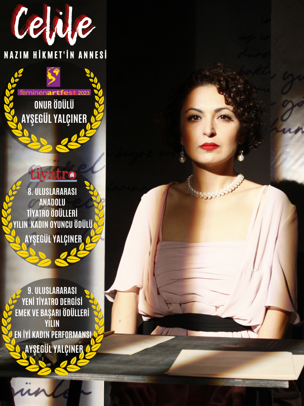 “Feminen Art Fest 2023 Onur Ödülü”,“Yılın En İyi Kadın Performansı” ve " Yılın Tiyatro Kadın Oyuncusu" ödüllerinin sahibi oyun “Celile” sahnelenmeye devam ediyor. Türkiye'nin bir çok ilinde izleyicisi tarafından ayakta alkışlanarak, ödüllerin en güzelini alan “Ayşegül Yalçıner'in” muhteşem performansına bir ödül de Yeni Tiyatro Dergisi'nden... 9 Uluslararası Emek ve Başarı Ödüllerinde “Yılın En İyi Kadın Performansı” ödülüne layık görülen